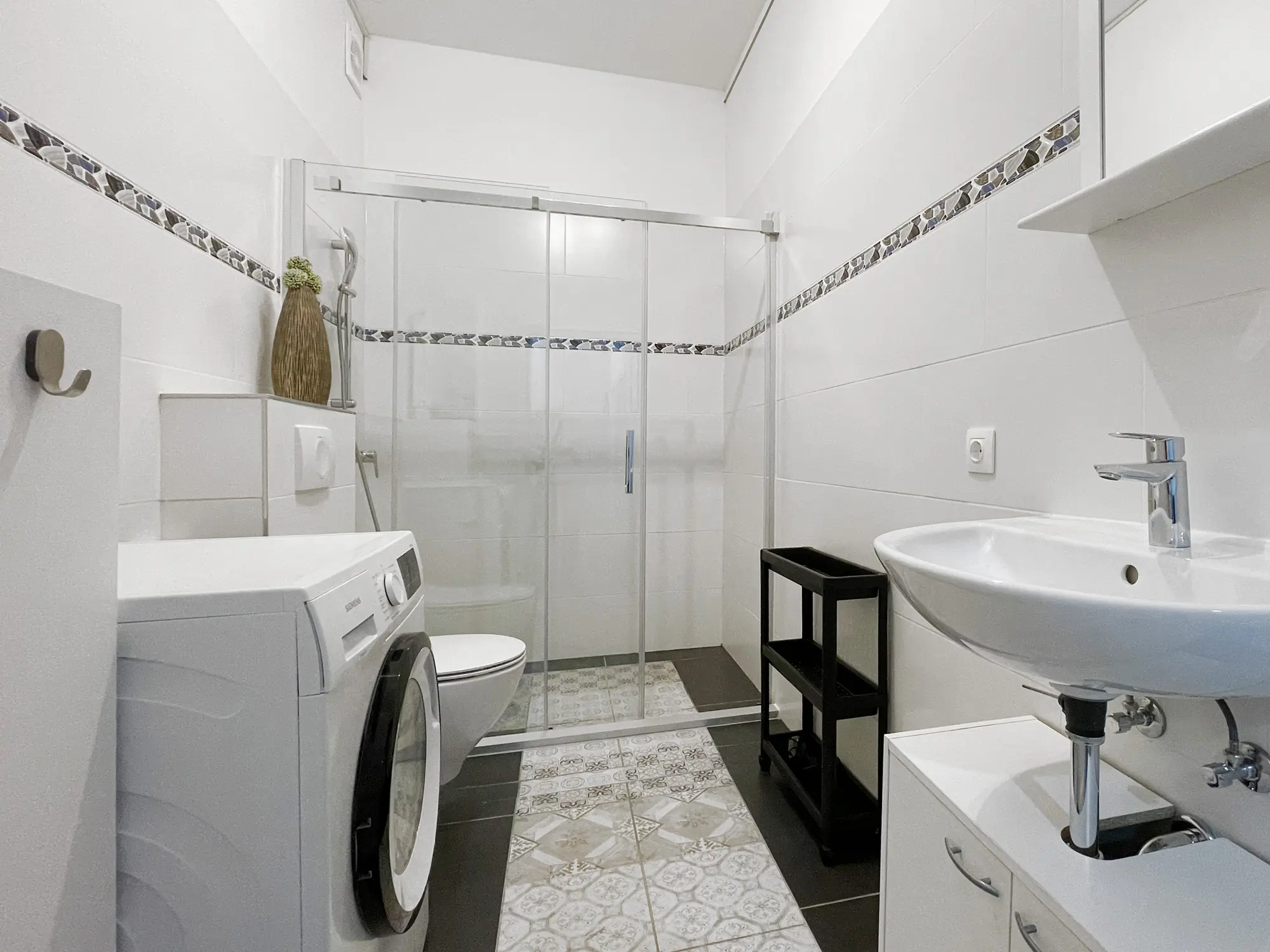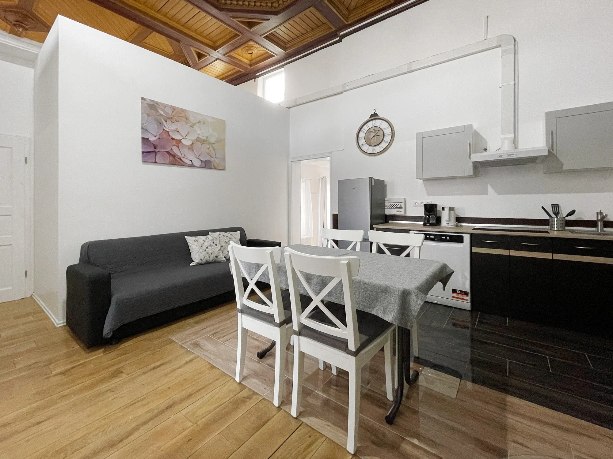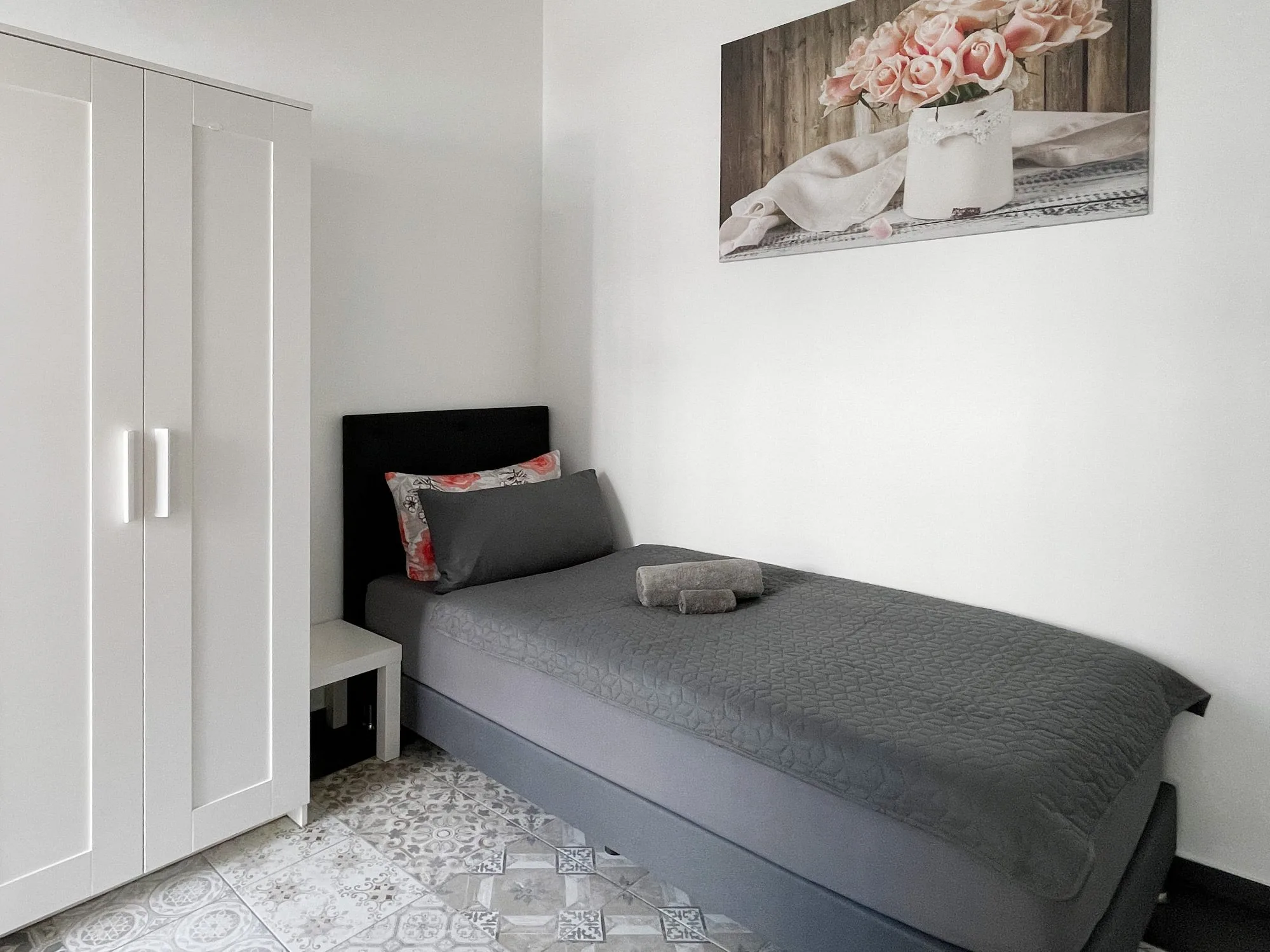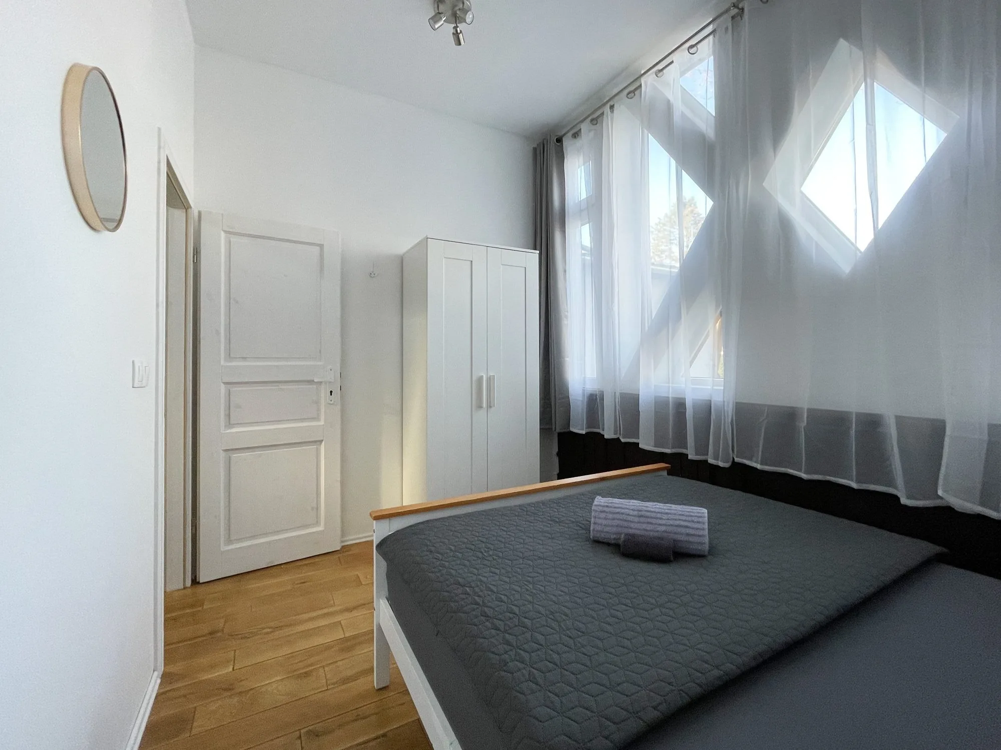 The apartment (65 sqm) has three bedrooms and a living room with kitchenette. It is located on the ground floor.